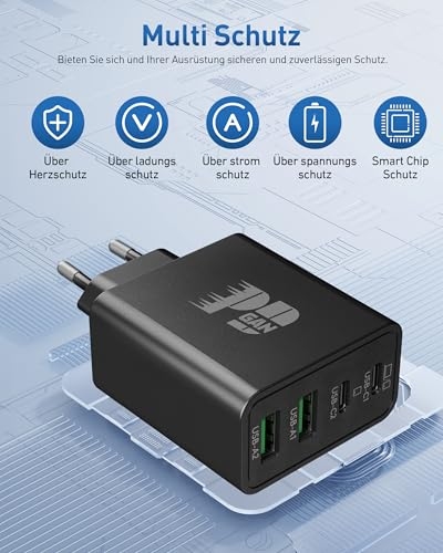 【65W USB C Schnellladegerät】: Das 65-Watt USB C ladegerät mit ladekabel kann Laden Sie Ihr MacBook Pro 16" von 0 auf 65% in einer Stunde, 30 Minuten schneller als andere Ladegeräte. 【Breite Kompatibilität】: Stecker mit PD 65W USB C und QC USB A Netzteil Max ausgang, genießen sie schnelle ladung für MacBook Pro/Air 13 Zoll/14 Zoll/15 Zoll, Laptop, iPad Pro/Air/Mini, ipad 10/11/A16 generation, iPhone 17e, iPhone 17 Pro Max Air, iPhone 16/16e/15 Pro Max Plus, 60W Samsung Galaxy S26 Ultra Plus S25 S24 S23 S22 S21 S20 Ultra FE 5G A56 Note 20 10 9 8, Tablests Tab, handys, für DJI Avata, für Laptop of HP Dell Lenovo Chromebook, telefone und Android/andere usbc geräte charger zubehör. 【2M USB C Schnellladekabel】: 2-Meter USB C auf USB C kabel Mit einer spitzen leistung von und ultra schnellen datenrate bis 480 MB/s. Ausgestattet mit exklusivem TPE mantel, flexiblen gelenken für 10.000 biege vorgänge für unüber troffene haltbarkeit, 2-meter länge (beliebteste Größe) für maximale reichweite. 【4-Port Mehrfach Ladegerät】: Mit der möglichkeit, USB C und USB A ports gleichzeitig zu verwenden, können sie 4 geräte gleichzeitig mit strom versorgen, ohne die geschwindigkeit oder leistung zu beeinträchtigen. 【Was Sie Erhalten】: USB-C USB-A ladegerät (4-Port, 65W) + USB C auf USB C kabel (2M).