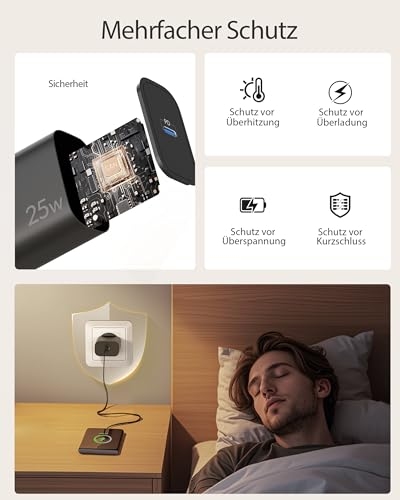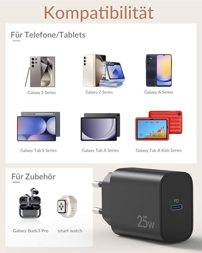 【25W Schnellladegerät】: Die adaptive Schnellladefunktion des Samsung USB C Netzstecker lädt Samsung-Mobilgeräte mit einer Leistung von bis zu 25W sicher und schnell wieder auf. Das Samsung S24 Ultra lädt bis zu 60% innerhalb von 30 Minuten. 【Breite Kompatibilität】: 25W USB C netzteil für Samsung Galaxy S25 S26, Galaxy S25+, Samsung S25 Ultra, Samsung Galaxy S24, Galaxy S24+, Samsung S24 Ultra, Galaxy S23, Galaxy S22, Galaxy S21, Galaxy S21 Ultra 5g, Galaxy S20 S10 S9 S8, Galaxy A71 A70 A90 A55 A54 A53 A52 A51 A34 A33 A23 A13 A12, Galaxy Note 20 Note 10 Note 9 Note 8, Galaxy Fold, Galaxy Z flip, Z Fold2, Galaxy Tablet Tab S9 S8 S7. 【Sicherer und zuverlässiger Schutz】: Der Typ C Schnellladegerät verfügt über einen integrierten Smart-Chip, der den Strom automatisch an die Bedürfnisse des Geräts anpassen kann. Überstrom-, Überspannungs- und Kurzschlussschutz schützt Ihr Gerät effektiv vor Schäden und sorgt für Sicherheit Nachts aufladen. 【60W USB C to C Schnellladekabel】: 60 Watt USB C auf USB C kabel 2M, mit stabiler Datenübertragungsleistung, kompatibel mit einer Vielzahl von Geräten mit USB-C-Schnittstelle ausgestattet. Das Kabel ist aus flexiblem Material für einfache Lagerung gemacht, und bis zu 2 M kann für eine Vielzahl von Szenarien geeignet sein. Starke und langlebige Kabelstärke, kann eine Vielzahl von intelligenten Geräten aufladen unterstützen. 【Sie werden】: 2*25 W USB C Schnellladegerät und 2*60W Typ C Ladekabel.