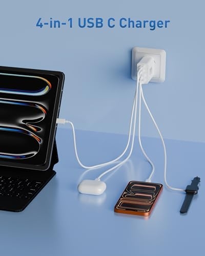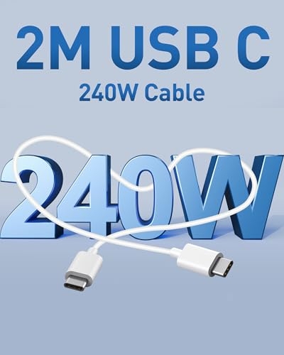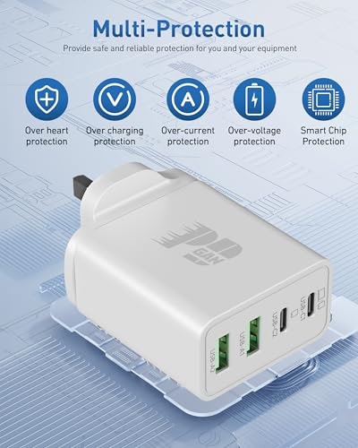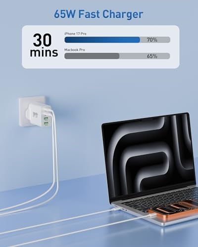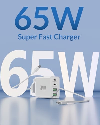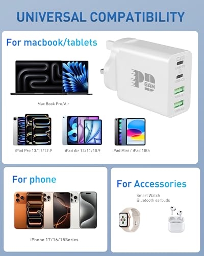【65W USB C Fast Charger】: The USB-C1 Port allow you to connect a single USB-C device to charge up to 65W, charge your MacBook Pro 16" from 0 to 65% in one hour, 30 minutes faster than other chargers. Charge your iPhone 17 Pro Max from 0 to 70% in 20-Minutes. 【240W USB C to C Cable】: With 240-Watt is the fastest Charging in History, all your devices can be charged at the fastest speed; Ultra-fast 480MB/s data transfer speed. Featuring an exclusive TPE sheath, flexible joints rated for 10,000 bends, and engineered for unprecedented durability. The 2-meter length (most popular size) ensures effortless reach wherever you need it. 【Wide Compatibility】: PD/PPS 65W Max USB C and QC USB A output, Suitable for all laptops Chromebook, tablets, and smartphones with USB-C ports, such as: Lenovo, HP, Dell, Acer, Asus, Google, MacBook, Microsoft, Huawei, Laptop Cellulari Tablet PC, enjoy fast charging for MacBook Pro/Air/Neo, 13/14/15/16 inch, Laptop, iPad Pro Air Mini, ipad 10/11 generation, iPhone 17/17e/17 Pro Max /17 Air,, iPhone 16/16e/15 Pro Max Plus, Samsung Galaxy S25/S26/S24/S23/S22 Ultra, Google Pixel 10 9 8 7 6, Tablets, android mobile phones, and other usb c device charger accessories. 【Multi Port USB Plug】: 4-Port designed GaN Tech with the ability to use dual USB C and USB A ports simultaneously, you can fast charge 4 devices at the same time without compromising speed or performance. 【What You Get】: USB C and USB A plug UK socket (4 port, 65W, White), USB C to USB C cable (2M, 240W, White).