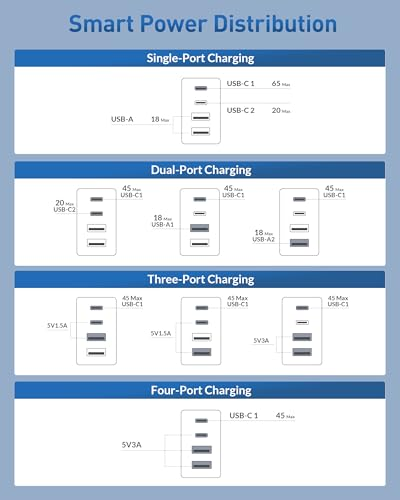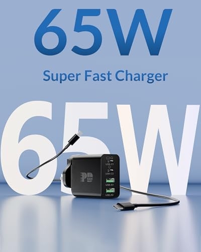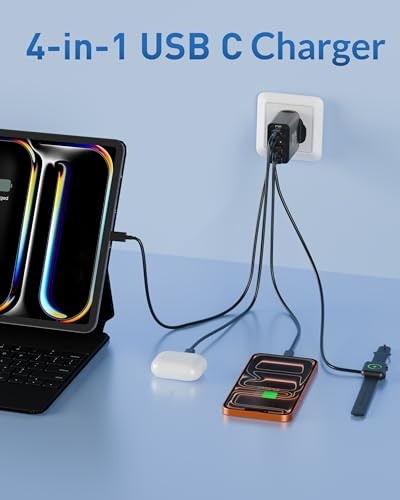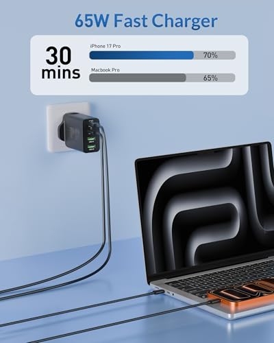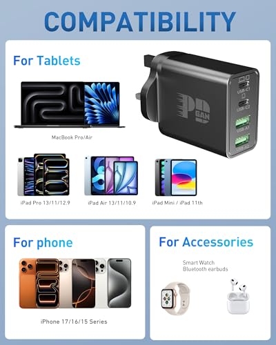 【65W USB C Fast Charger】: The USB-C1 Port allow you to connect a single USB-C device to charge up to 65W, charge your MacBook Pro 16" from 0 to 65% in one hour, 30 minutes faster than other chargers. Charge your iPhone 17/ Samsung S26 S25 from 0 to 70% in 20-Minutes. 【60W/2M USB C to C Cable】: 60W USBC Cord ensure all your devices can be charged at the fastest speed; Ultra-fast 480MB/s data transfer speed. Featuring an exclusive TPE sheath, flexible joints rated for 10,000 bends, and engineered for unprecedented durability. The 2-meter length (most popular size) ensures effortless reach wherever you need it. 【Wide Compatibility】: PD/PPS 65W Max USB C and QC USB A output, Suitable for all laptops Chromebook, tablets, and smartphones with USB-C ports, such as: Lenovo, HP, Dell, Acer, Asus, Google, MacBook, Microsoft, Huawei, Laptop Cellulari Tablet PC, enjoy fast charging for MacBook Pro/Air, 13/14/15/16 inch, Laptop, iPad Pro Air Mini, ipad 10/11 generation, iPhone 17e / iPhone 17 Pro Max /17 Air / 16/16e/15 Pro Max Plus, Samsung Galaxy S26 Ultra S25/S24/S23/S22 Ultra, Google Pixel 10 9 8 7 6, Tablets, android mobile phones, and other usb c device charger accessories. 【Multi Port USB Plug】: 4-Port designed GaN Tech with the ability to use dual USB C and USB A ports simultaneously, you can fast charge 4 devices at the same time without compromising speed or performance. 【What You Get】: USB C and USB A plug UK socket (4 port, 65W), USB C to USB C cable (2M, 240W).