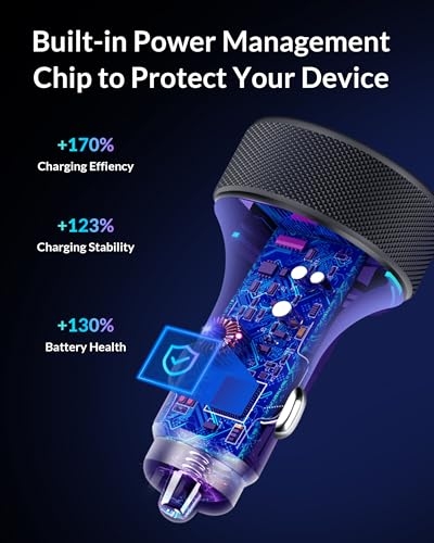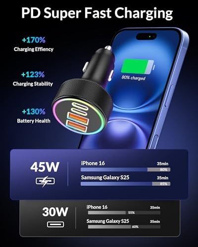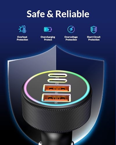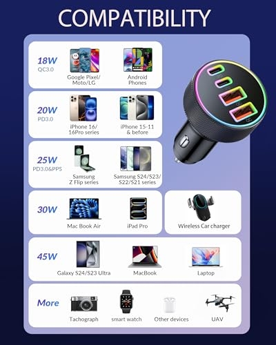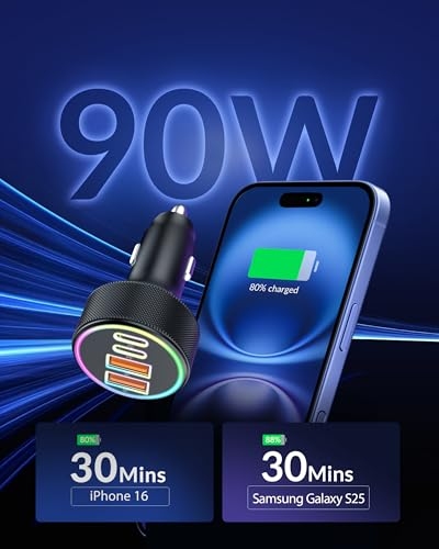 4-Port Cigarette Lighter: The car charger 4 in 1, equipped with 4 USB ports and LED, provides a practical solution for charging multiple devices simultaneously. Fit for both Android and iPhone users, it ensures fast, efficient charging and keep your car clutter-free. 90W Car Charger: USB C car charger is a PD 45W USB C port and 45W USB A port, allowing up to four devices to be charged at once. It can charge iphone and Samsung up to 80% and iPad up to 60% at 35mins, ensuring all your devices stay powered without slowing down the charging speed Safety System: Car Charger provides exclusive Multi-protect safety technology provides complete protection for you and your devices while delivering durable, long-lasting products. What’s more, LED indicator helps locate the usb ports in the dark without being distracting. Comprehensive Compatibility: The 4 in 1 car charger supports USB C and USB A devices, ensuring all your device are covered, being compatible for iPhone 17 Air/17/16/15/14/13/12 series/16e; Samsung Galaxy S25/S26/S24/ S23 /S22/ S21series; Google Pixel 10/9/8/7/ 6, etc. What You Get:90W USB C Cigarette Lighter Adapter. Reliable and friendly customer service response within 24 hours and 12 months warranty.