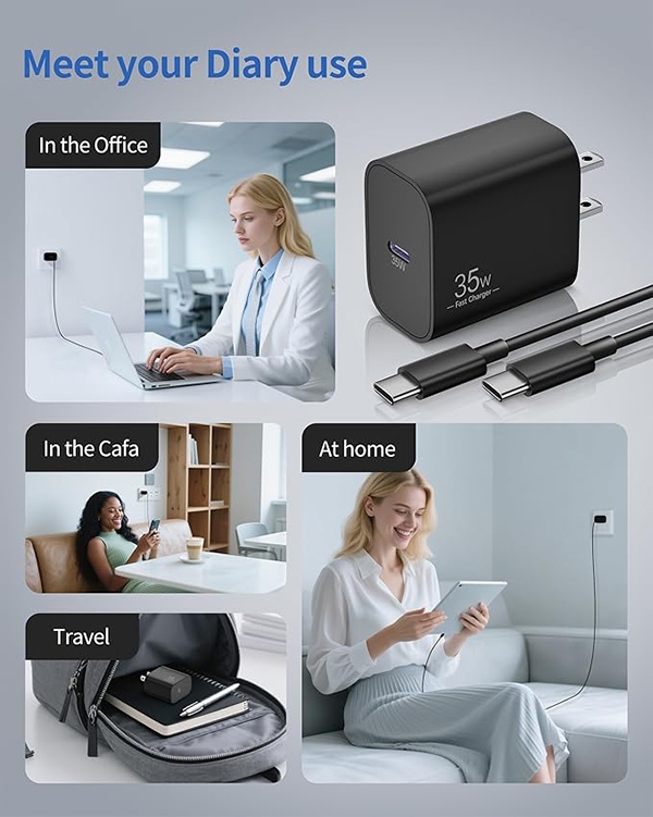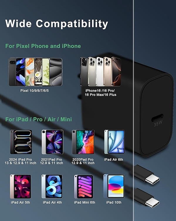 Model Number: CA-50T Manufacturer: Shenzhen Dipinle Technology Co., Ltd. 35W Fast Charging for Google Pixel Series: Enjoy fast charging with 35W Max output for your Google Pixel 10/9/8, Google tablet, and other USB-C devices. Charge for your Google Pixe 10/9 Pro XL up to 60% in just 30 minutes, 5X Fast charging speed, help you work efficiently 3FT Pixel Fast Charger Cord: The 3ft length lets you freely charge for your Pixel devices from different occasions such as on couch, bedroom, at offices, or on the go. Supports PD fast charging up to 60W (3A/20V) and data transfer speeds 480Mbps Widely Compatibility: 35W USB C Fast wall charger for Google Pixel 10/10a/10 Pro/10 Pro XL/10 Pro Fold/9/9 Pro/9 Pro XL/9 Pro Fold/8/8a/8 Pro/7/7a/7 Pro/6/6a/6 Pro/5/5a/4/4a 5G/4 XL/3a/3a XL, Pixel Tablet, Pixel Slate, Pixelbook, Samsung Galaxy S26/S25/S24/S23/S22/S21/S20/Ultra, Note 20/10, LG, Moto, Tablet, Android Phones, and more Safe and Reliable: This Pixel fast charger built in smart IC chip, automatically matches the current required by the device to maximize the charging efficiency. Multiple safety protection systems to prevent over-charging, overheating and short-circuit to keep connected devices safe What You Get: 2 x 35W USB C Wall Charger Block Power Adapter, 2 x 3FT USB C to USB C Cable. If you have any questions or issues, please get in touch with us. Our dependable customer care will keep online 24/7 and respond to you with a suitable solution