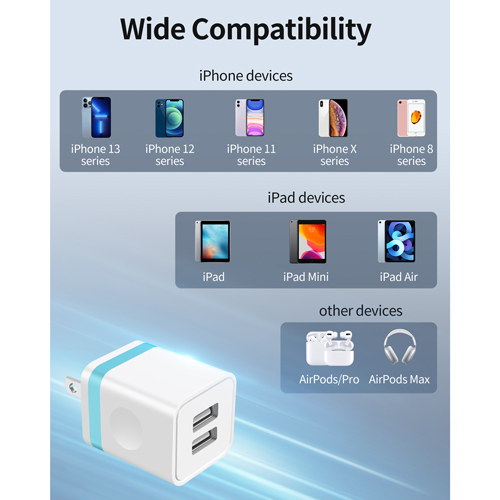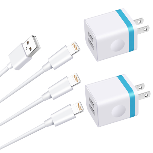 Fast Charging & Data Sync: iPhone wall charger charge 15% faster than regular USB Charger with new intelligent IC chip tech, up to 2.1amps/5V; copper wires in charger cord strengthening signal and sync data transfer up to 480mbps. Safe Protection: Built-in safety switch in USB Plug against over-current, over-voltage, over-heating and short-circuit, ensuring maximum safety; PC shell made with premium fireproof materials. 2-Port 2-USB Wall Charger: Simultaneously charging two devices with high-speed; automatically recognizing devices and maximizing the charging efficiency; small and compact design. Compatibility: Compatible with iPhone SE 2020/ 11/ XS MAX / XS / XR / X, iPhone 8 / 8 Plus, iPhone 7 / 7 Plus, iPhone 6 / 6 Plus / 6S Plus/ 6S, iPhone SE / 5S / 5C / 5, iPad / Air / Pro / Mini. What You Get: 3-Pack USB Cables (10-Foot, 6-Foot, 3-Foot) and 2-Pack Phone Wall Charger Block.