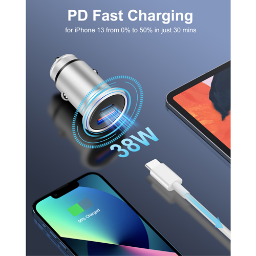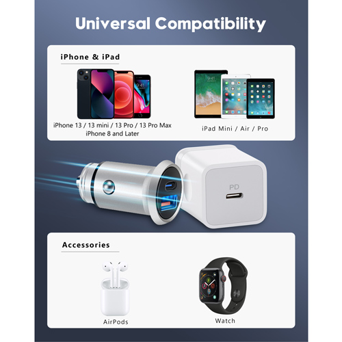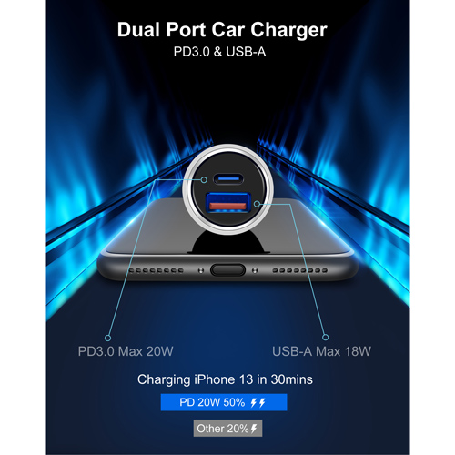iPhone car charger adopt Quick Charger PD3.0 & USB-A technology, dual ports can fast charging 2 devices at the same time(PD 20W Max & USB-A 18W Max), spend less time charging in your car.