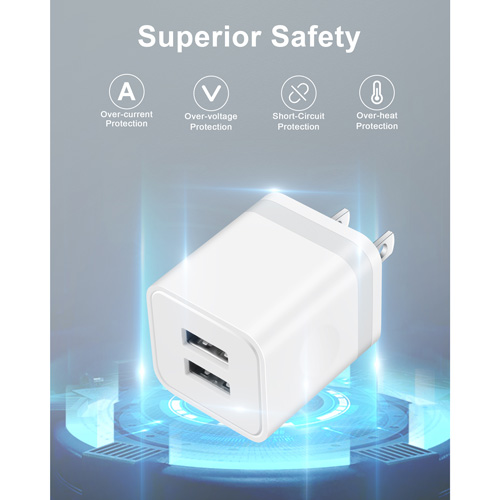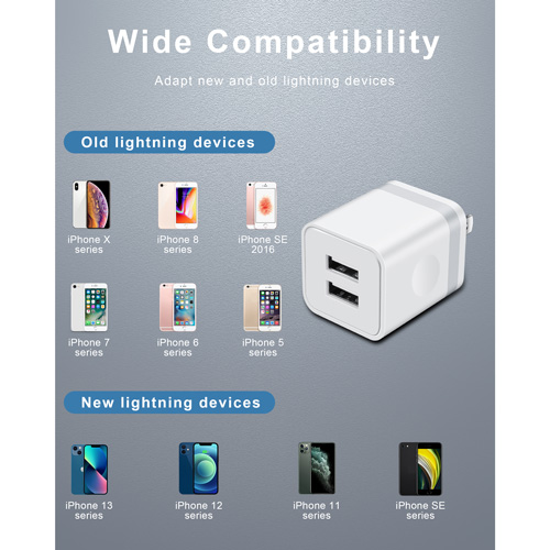 [Widely Compatibility]: USB Wall Charger compatible with iPhone 13 / 12 Pro Max / Mini / 11 / XS / XR / X / 8 / 7 / 6 / 6S Plus SE 5S, iPad, AirPods, Samsung, LG, Moto, Google Pixel, Android Phones, and More. [Powerful Charging]: USB Plug has a maximum output of 2.1A/5V, which enables automatically match the optimal current and charge two devices at the same time. [Superior Safety]: Charging block equipped with a wide range of intelligent safety protection system, automatically control temperature and adjust current output, Prevent over-heating, over-current, short circuit, to protect your connected devices. [Compact Designed]: Heat resistant and anti-throw design, Small size and easy to carry, ideal for home, office, travel and business trip. [What You Get]: 3 X Dual Port USB Wall Charger Block. Friendly customer service.