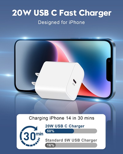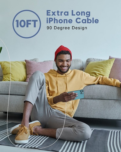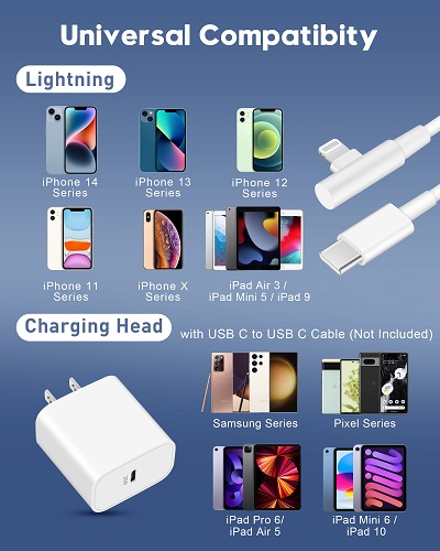 【iPhone Charger Fast Charging】20W PD USB C Charger Block with 10FT Right Angle USB C to Lightning Cable provide max 20W output, charge your iPhone 14/13 up to 50% in just 30 minutes, 3X faster than the original 5W charger, saving about 1.5 hour for you. 【90 Degree Right Angle Design】The 10FT Long USB C to Lightning Cable has a unique right angle design, which is more comfortable for playing games, watching videos or reading e-books when you lie on the couch or bed while charging. Reinforced stress point design can withstand more than 15000+ bending tests, more durable and flexible. 【Widely Compatibility】 Designed for iPhone 14/13/12/11/Pro Max/iPhone 8 and later. The USB C Wall Charger to support fast charging for iPhone 14/14 Plus/14 Pro/14 Pro Max/13/13 Mini/13 Pro/13 Pro Max/12/12 Mini/12 Pro/12 Pro Max/11/11 Pro/11 Pro Max/XS Max/X/XR/XS/SE 2020/SE 2022/8 Plus, iPad Pro 2017, iPad Air 3, iPad Mini 5 / 4, iPad 9/8/7/6, AirPods. This PD 3.0 Type C charging block also charge for iPhone 7/7 Plus/6/6S/Plus/5S/5C/5/SE, AirPod at an original charging speed. 【Apple MFi Certified】With the Apple MFI chip, usb c to lightning cable is equipped with automatic chip recognition function and fully supports IOS versions (No error message pops up). Use the upgraded C94 terminal design chip, enjoy fast charging & 480Mbps data sync. Built-in over-voltage, over-current and other multiple safety protection system ensure that your Apple device can charge safely at the fastest speed. 【What You Get】 2-Pack 20W USB C Power Adapter and 2-Pack 10FT USB-C to Lightning Cable (90 Degree). If you have any questions, please feel free to contact us, we will resolve your issue within 24 hours.