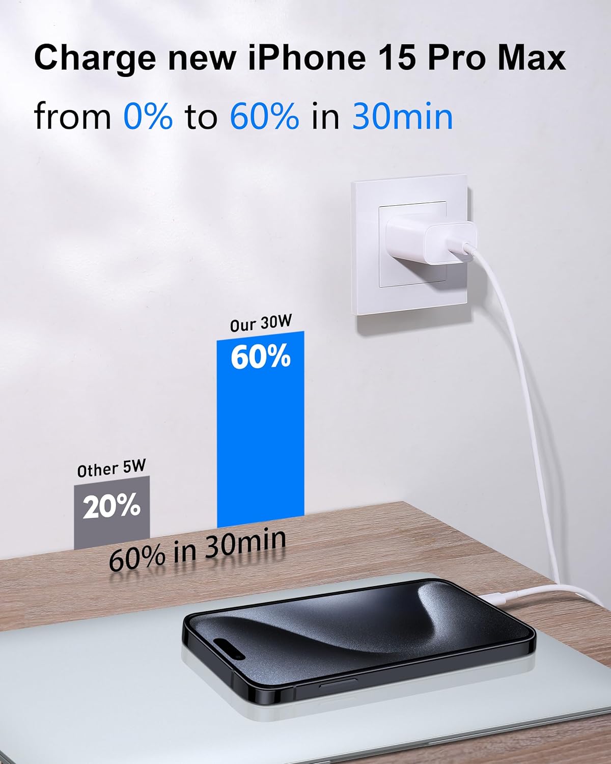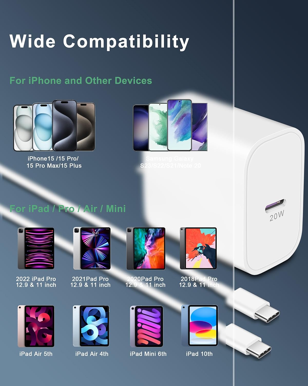 [For new iPhone 15 and iPad] USB C wall charger block with USB-C to USB-C Cable kit fast charge for iPhone 15/15 Plus/15 Pro/15 Pro Max, iPad Pro 12.9/11 inch, iPad Air 5/4, iPad Mini 6, iPad 10, AirPods Pro, and also fast charge for Google Pixe 8/8 Pro/7/7 Pro/6/6 Pro/5/4/3 XL, Galaxy S23 S22 S21 S20 Ultra, Note 20/Note 10, and more USB-C Devices. [20W USB-C Fast Charging] The iPhone 15 charger block has a maximum output of 20W and USB-C port design, Fast charge for your iPhone 15 from 0% to 55% in just 30 minutes. Help you work efficiently. [iPhone 15 USB C to C Cable] Friendly reversible design, enhanced one-piece stretch process, 15000+ bend test, this usb c cable is fracture resistant and durability. 480Mbps data transfer and max 60W/3A output, fast charging and syncing 2-in-1. [Safety First] USB C power adapter built in intelligent IC chip, automatic recognition of charging devices, equipped with multiple safety protection systems to prevent overcharging and overheating, ensuring peace of mind while charging. [What You Get] 2 x 20W USB C Wall Charger Block, 2 x 6FT USB C to USB C Charger Cable.