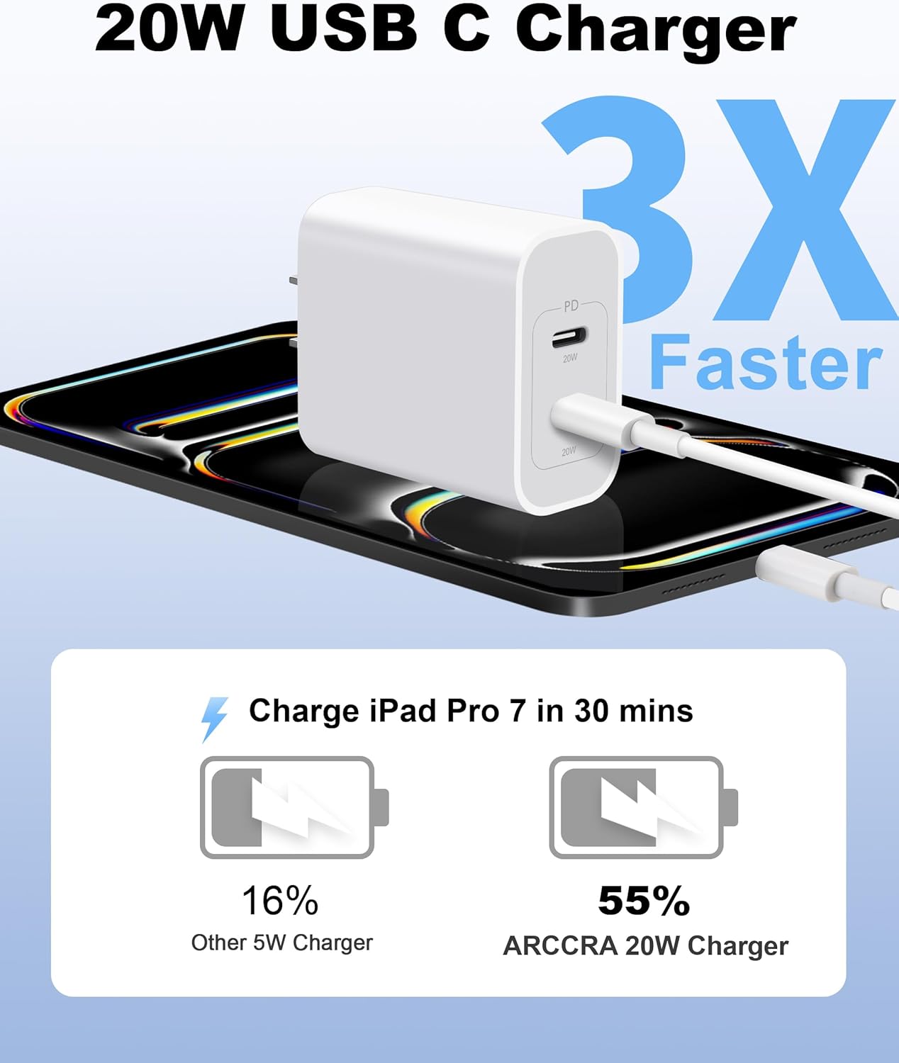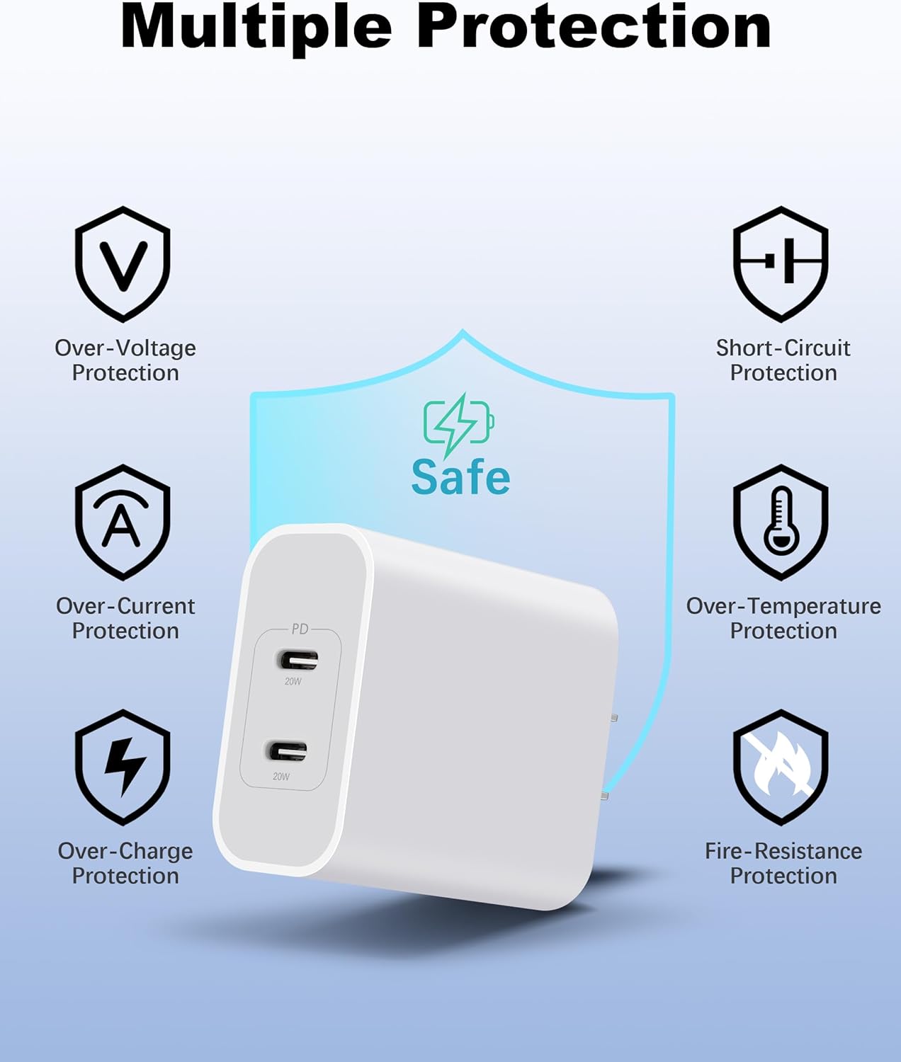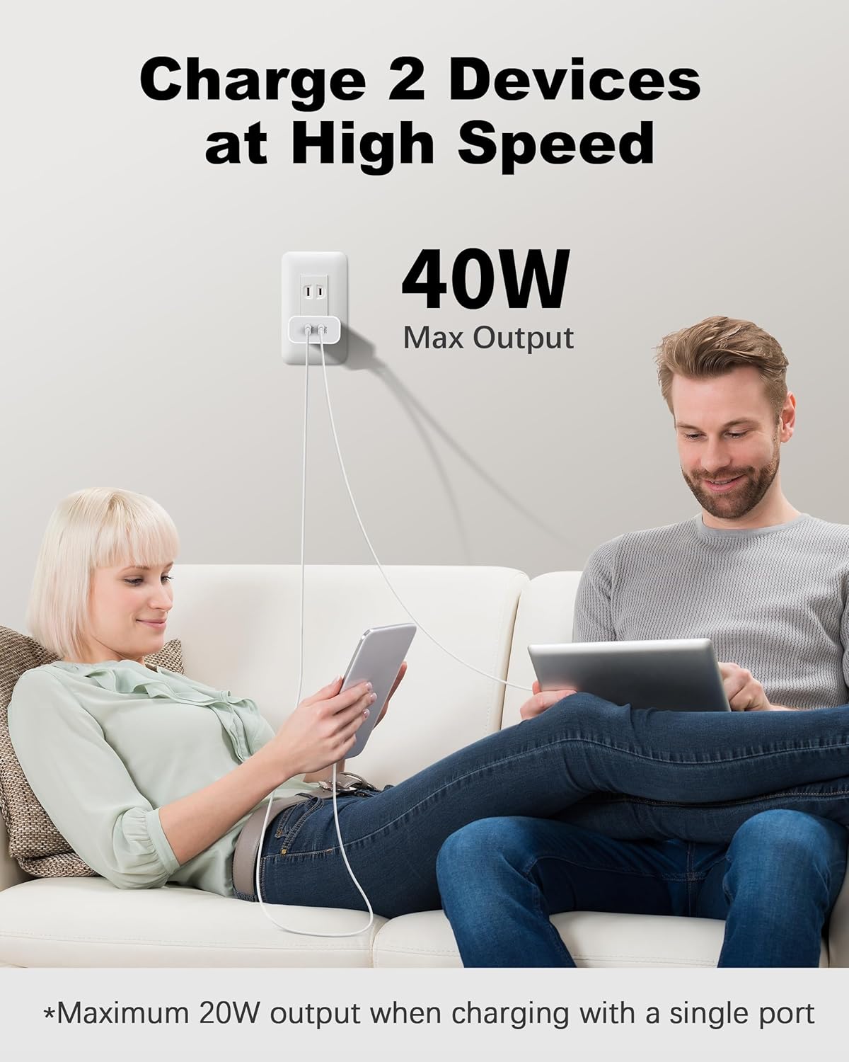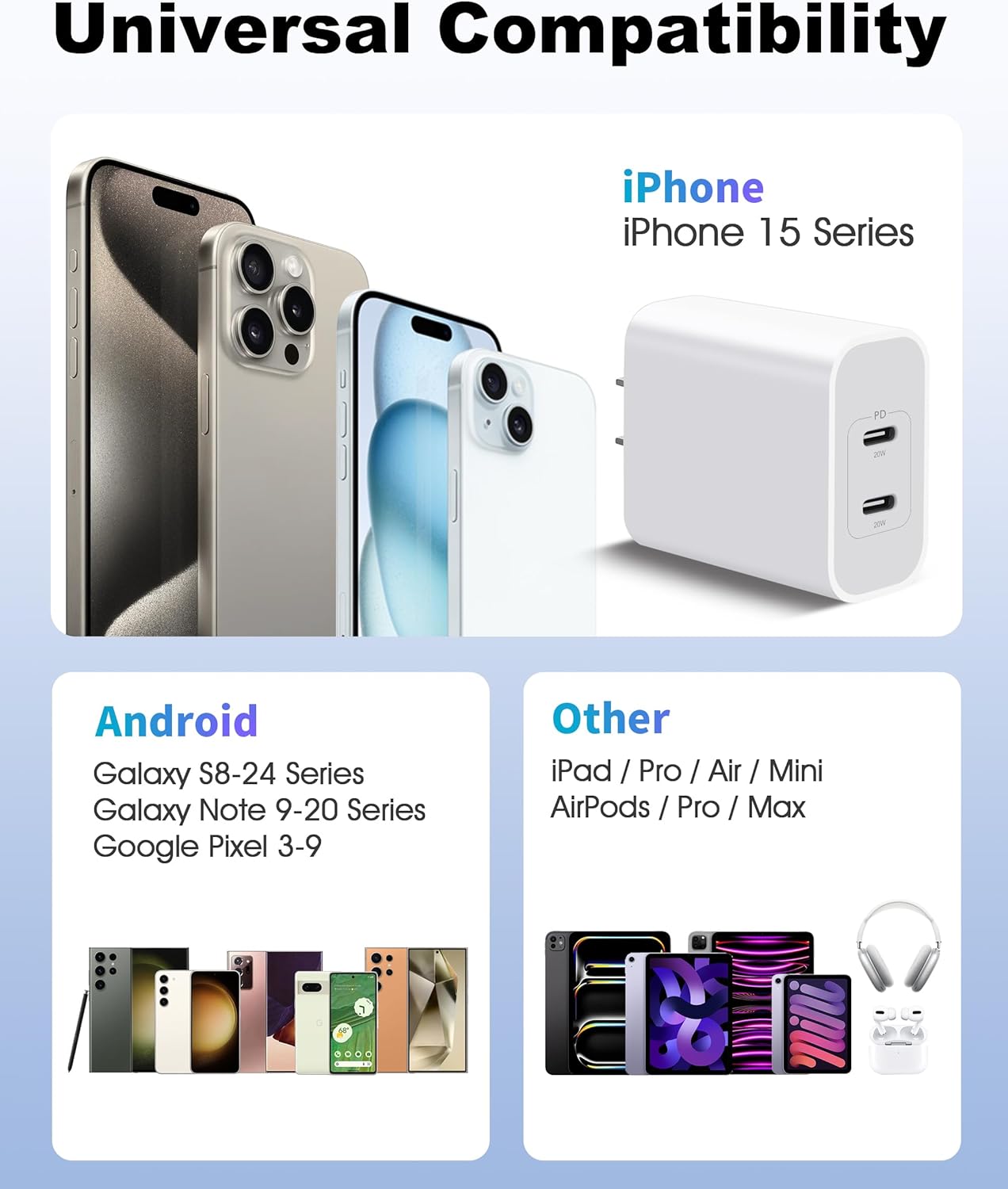 Widely Compatibility: 40W USB C charger block compatible with iPhone 16/16 Plus/16 Pro/16 Pro Max/15/15 Plus/15 Pro/15 Pro Max, iPad Pro 13/12.9/11 inch, iPad Air 5th/4th, iPad 10th, iPad Mini 6th, AirPods Pro, Vision Pro, Watch, Samsung Galaxy S24/S23/S22/S21/S20/Ultra, Note 20/10, Google Pixel 8/7/6/5/4/3 XL, LG, Moto, Android Phones, and more 40W Fast Charging: USB C wall charger supports max power output of 40W, with dual USB-C port design, which enables to charge your two smart phones or tablets devices simultaneously at high speed. Charge for your iPhone 15 from 0% to 60% in just 30 minutes 6FT/10FT USB C to C Cable: The [6FT+10FT] long type c charger cord featured hard-wearing TPE, enduring more than 15,000+ times bending test, durability and long-lasting. 480Mbps data transfer and max 3A current output, fast charging and data syncing 2-in-1. Safe & Reliable: Built in smart IC chip, automatically matches the current required by the device to maximize the charging efficiency. Equipped with multiple safety protection systems to prevent over-voltage, over-charging, overheating and short-circuit to keep connected devices safe What You Get: 2-Pack 40W Dual USB C wall charger and [6FT + 10FT] long USB-C to USB-C cable. ARCCRA 40W USB C power adapter cube offers fast, efficient charging in the office, at home, bussiness trip or on the go