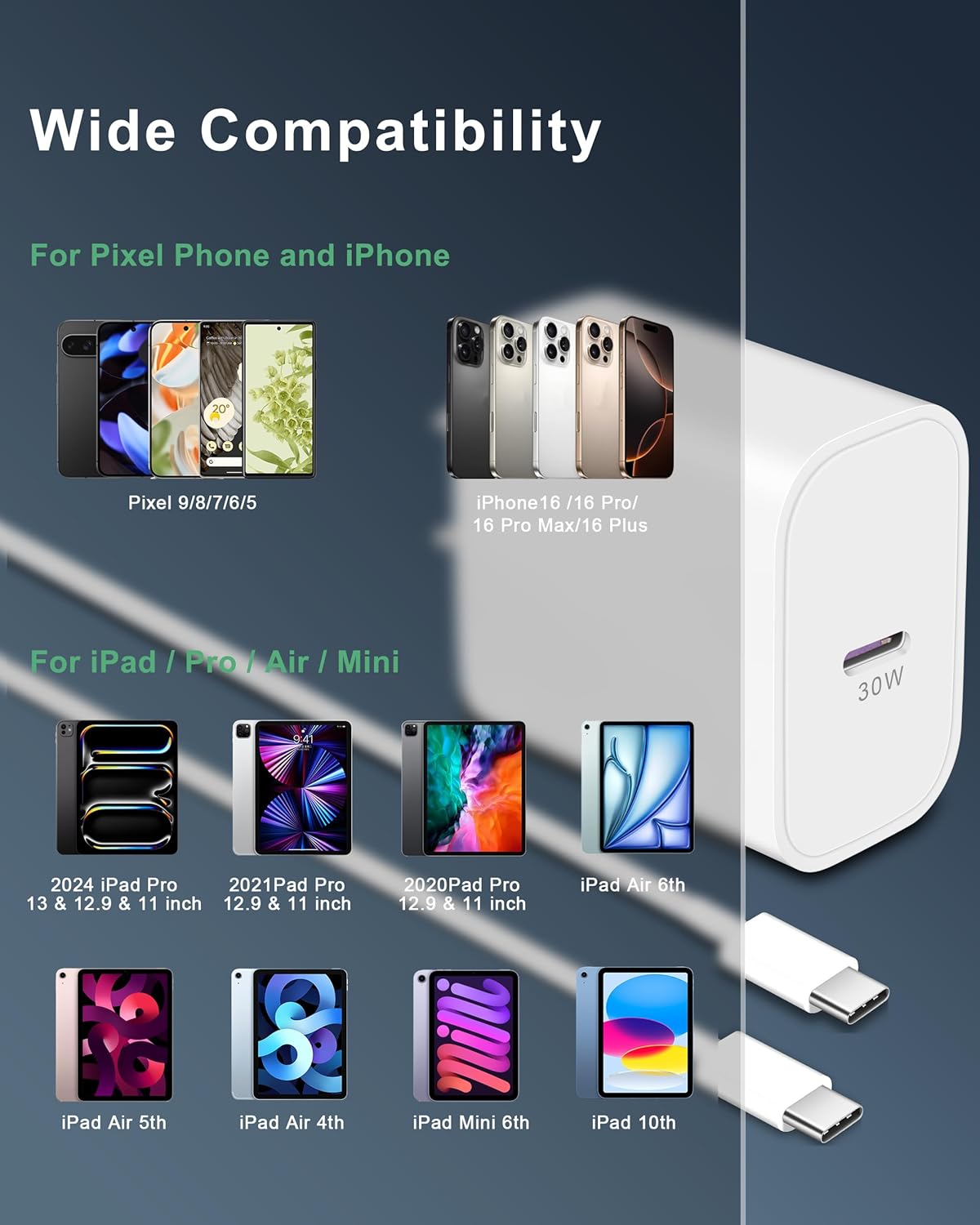 Designed for Google Pixel Series: Experience the power of PD fast charging technology with this 20W USB-C Charger. Charge for your Pixel 8/7/6 up to 50% in just 30 minutes, enjoy fast charging with 20W max output for your Google Pixel series 6FT USB C to C Cable Fast Charging: The 6ft length lets you freely charge for your Pixel devices from any occasions such as on couch, bedroom, at offices, or on the go. Supports PD fast charging up to 60W (3A/20V) and data transfer speeds 480Mbps Widely Compatibility: 20W USB C charger block for Google Pixel 9/9 Pro/9 Pro XL/9 Pro Fold/8/8 Pro/7/7a/7 Pro/6/6a/6 Pro/5/4/3/2 XL, Samsung Galaxy S24/S23/S22/S21/S20/Ultra/S10/S9/S8 Plus, Note 20/10, A55/A54/A53/A35/A15/A70/A72, LG, Moto, Android Phones, and more Safe and Reliable: Built in smart IC chip, automatically matches the current required by the device to maximize the charging efficiency. Equipped with multiple safety protection systems to prevent over-voltage, over-charging, overheating and short-circuit to keep connected devices safe What You Get: 2 x 20W USB C Wall Charger Block, 2 x 6FT Type C to C Charging Cable. If you have any questions or issues, please get in touch with us. Our dependable customer care will keep online 24/7 and respond to you with a suitable solution