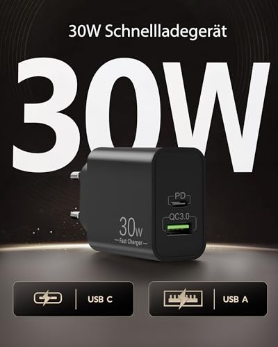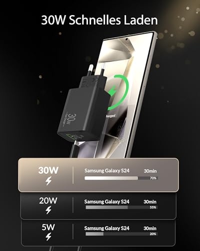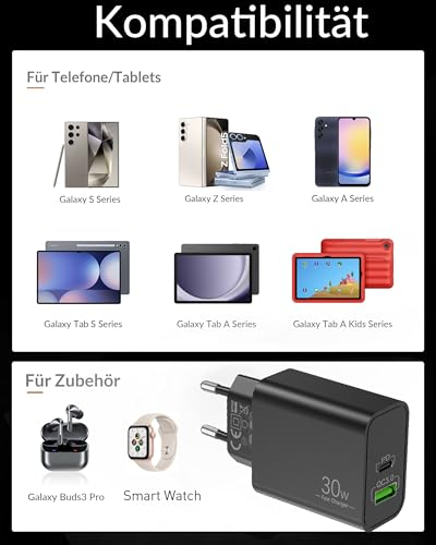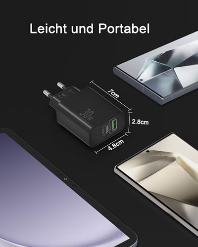 【2-Port Ladegerät】: Unterstützt PD 30W Max (USB C) und QC 30W Max (USB A) quick charge 3.0 ausgang, schnelles aufladen für die meisten USB A und USB C geräte gleichzeitig; eine USB netzstecker für alle Ihre USB A & USB C geräte, Ihr idealer reisebegleiter. 【30W USB C Schnellladegerät】:Blitzschnelle ladegeschwindigkeiten für das Samsung über den USB C ausgang und die intelligente PD technologie, laden sie Ihr Samsung Galaxy S26 Ultra in nur 30 Minuten bis zu 70 % auf. 【Sicherheit Zertifiziert】:Das USB C stecker/Steckdose für das Samsung verfügt über ein eingebautes mehrfach schutz system und einen intelligenten chip. Verwendung von hitzebeständigen, niedertemperaturbeständigen, chemikalienbeständigen, feuerbeständigen materialien, um Überspannung, Überhitzung usw. Zu vermeiden, maximieren sie Ihre akkulaufzeit. 【Breite Kompatibilität】: 30W USB C netzteil/ladestecker für Samsung Galaxy S26 Ultra Plus S26+, Samsung Galaxy S25 Ultra Plus, Samsung Galaxy S24, S24+, S24 Ultra, Galaxy S23, Galaxy S22, Galaxy S21, Galaxy S21 Ultra 5g, Galaxy S20 S10 S9 S8, Galaxy A71 A70 A90 A55 A54 A53 A52 A51 A34 A33 A23 A13 A12, Galaxy Note 20 Note 10 Note 9 Note 8, Galaxy Fold, Galaxy Z flip, Z Fold2, Galaxy Tablet Tab S9 S8 S7. iPhone 17 16 15, Google Pixel 10 9 8 7. 【Was Man Bekommt】: 1-Pack 30W schnellladegerät quick charge 3.0 Ladegerät (Schwarz).