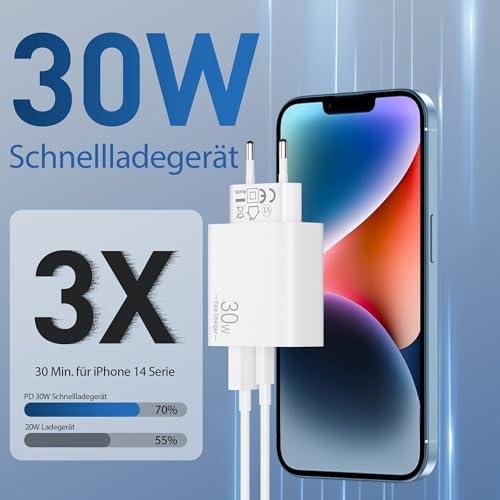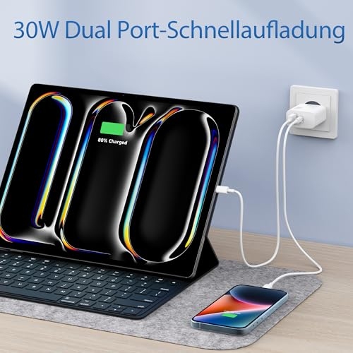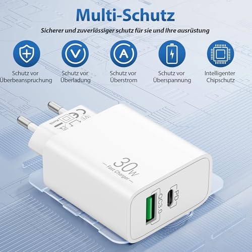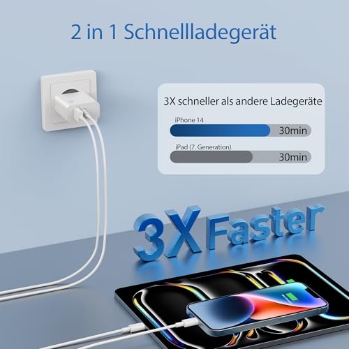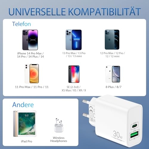 【30W USB C Schnellladegerät】: Das 30W USB C ladegerät mit ladekabel kann iphone 14 in nur 30 minuten auf 70% aufladen, während 20W ladegerät auf 55%, spart mehr als 0,5 stunden ladezeit. 【Breite Kompatibilität】: USB Stecker mit PD 30W Max USB C und QC USB A ausgang, genießen sie schnelle ladung für apples iPhone 14 Pro Max / 14 Pro / 14 Plus / 14 / 13 Pro Max / 13 Pro / 13 / 13 mini / 12 Pro Max / 12 Pro / 12 / 12 mini / 11 Pro Max / 11 Pro / 11 / SE (2-3rd) / XS Max / XS / XR / X / 8 Plus / 8; iPad Pro 1. Generation 12.9/9.7 Zoll (Modell 2015/2016); iPad Pro 2. Generation 12.9/10.5 Zoll (Modell 2017); iPad Air 3./2./1. Generation (Modell 2019/2014/2013); iPad mini 5./4./3./2./1. Generation (Modell 2019/2015/2014/2013/2012); iPad 9./8./7./6./5./4. Generation (Modell 2021/2020/2019/2018/2017/2012). 【Gleichzeitiges Aufladen über mehrere Ports】: Mit der möglichkeit, USB C und USB A ports gleichzeitig zu verwenden, können sie zwei geräte gleichzeitig mit strom versorgen, ohne die geschwindigkeit oder leistung zu beeinträchtigen. 【Sicherheit geht vor】: Ruhen sie sich ruhig aus, wissend, dass das multiprotect sicherheitssystem umfassenden schutz für Ihre geräte bietet und Ihnen während des ladens ruhe gibt. 【Was Sie Erhalten】: 2*USB-C ladegerät (2-Port, 30W), 2*2M lightnings kabel.