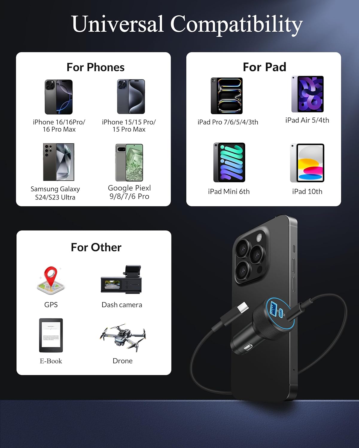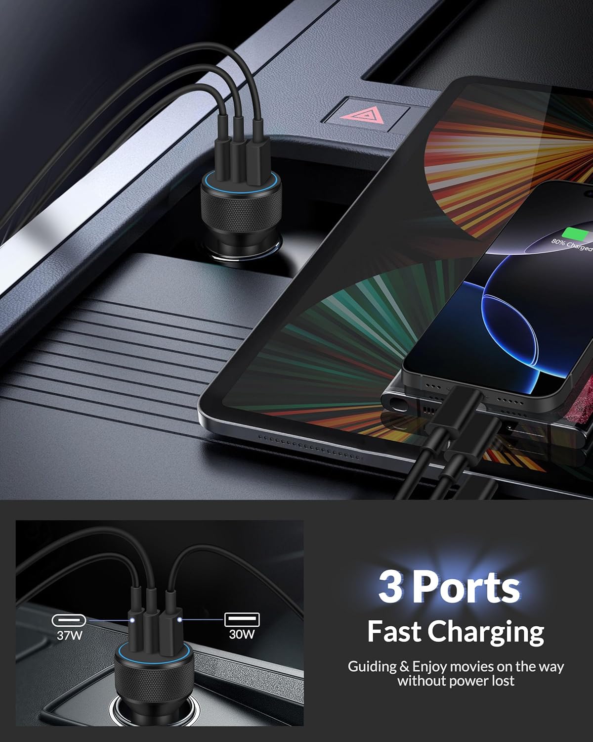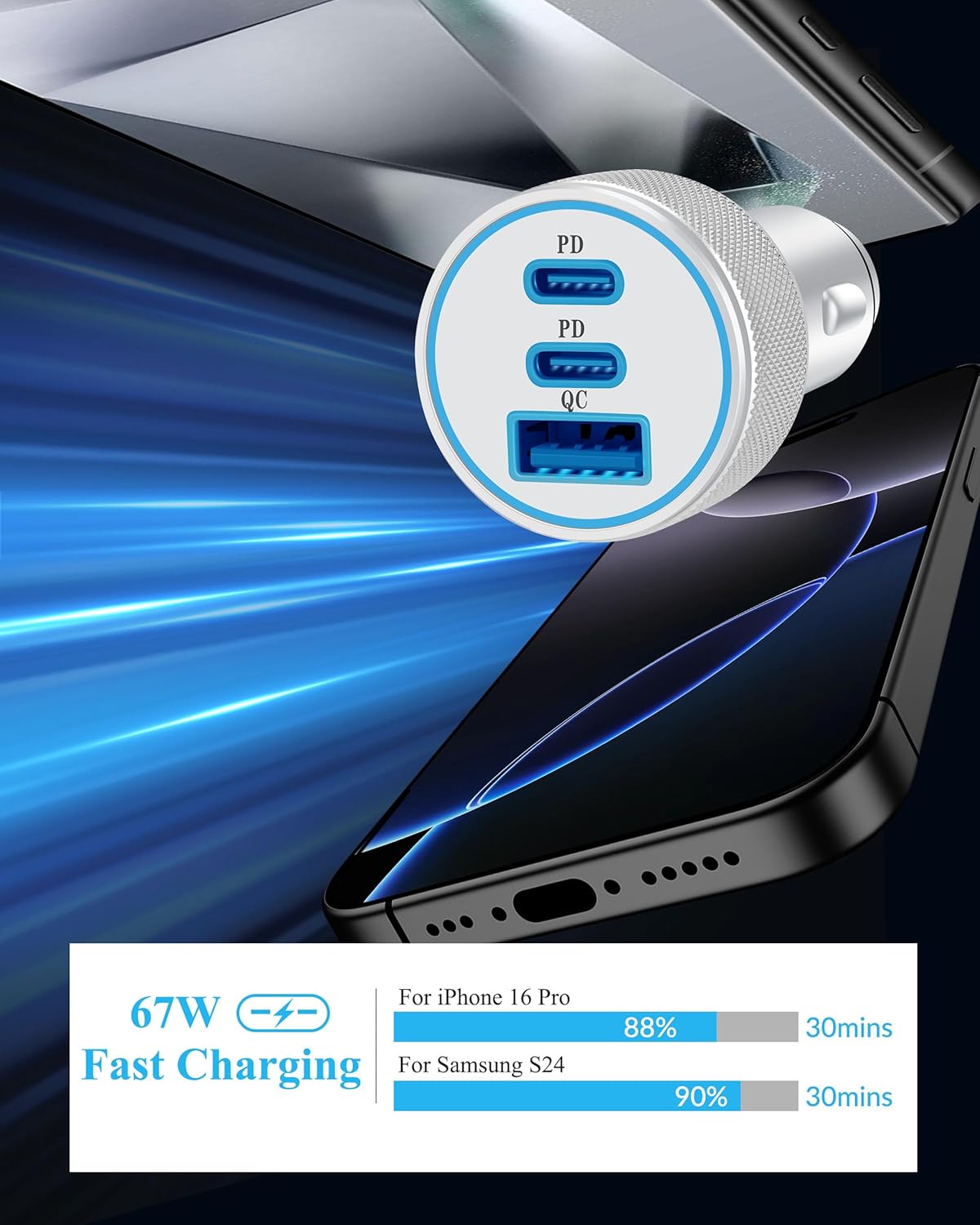67W 3-Port Fast Charging: 67W USB C car charger provides PD 37W(Max) and QC 30W(Max) high output, 37W USB-C port can provide fast charging for your iPhone 16 from 0% to 80% in 30 minutes. This car charger supports fast charging of 3 devices simultaneously. Say goodbye to the hassle of carrying multiple chargers for different devices 2Pack USB C to C Cable: Aiming to offer more convenient driving experience, attached a 3ft 60W USB C to C cable featured hard-wearing TPE, enduring more than 15,000+ times bending test without break. this usb c cable is fracture resistant and durability. Supports 480Mbps data transfer and max 3A current output, fast charging and data syncing 2-in-1 Safe Charging: Built-in smart IC chip of the Type-C car charger automatically adjusts the power output and automatically matches the current required by the iPhone device to maximize the charging efficiency. Equipped with multiple safety protection systems to prevent over-voltage, over-charging, over-heating and short-circuit to protect your connected devices Widely Compatibility: 67W Fast car phone charger cigarette lighter is compatible with devices that support PD, QC3.0, AFC, MTK, FCP, including smart phones, tablets, laptops, smart watch, etc. Compatible with iPhone 16/16 Plus/16 Pro/16 Pro Max/15/15 Plus/15 Pro/15 Pro Max, iPad Pro 13/12.9/11 inch, iPad Air 5th/4th, iPad Mini 6, iPad 10th, AirPods Pro, Google Pixel 9/9 Pro/9 Pro XL/9 Pro Fold/8/8a/8 Pro/7/6/5/4/3/XL, Samsung Galaxy S24/S23/S22/S21/S20/Ultra/Note 20/10, Z Flip 6/5/4, Z Fold 6/5/4, LG, Moto, Android Phones and more What You Get: 1x 67W 3-Port USB C Car Charger Adapter, 2x 3FT USB C to USB C Charging Cable. Suitable use for you family and friends traveling or on the go (Input:DC 12-24V)